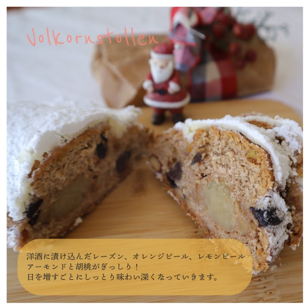 全粒粉(国内製造)、バター、牛乳、砂糖、はちみつ、アーモンド、レーズン、くるみ、酵母、塩、オレンジピール、レモンピール、ラム酒、キルシュワッサー、アマレット、シナモン、香辛料、バニラ/香料